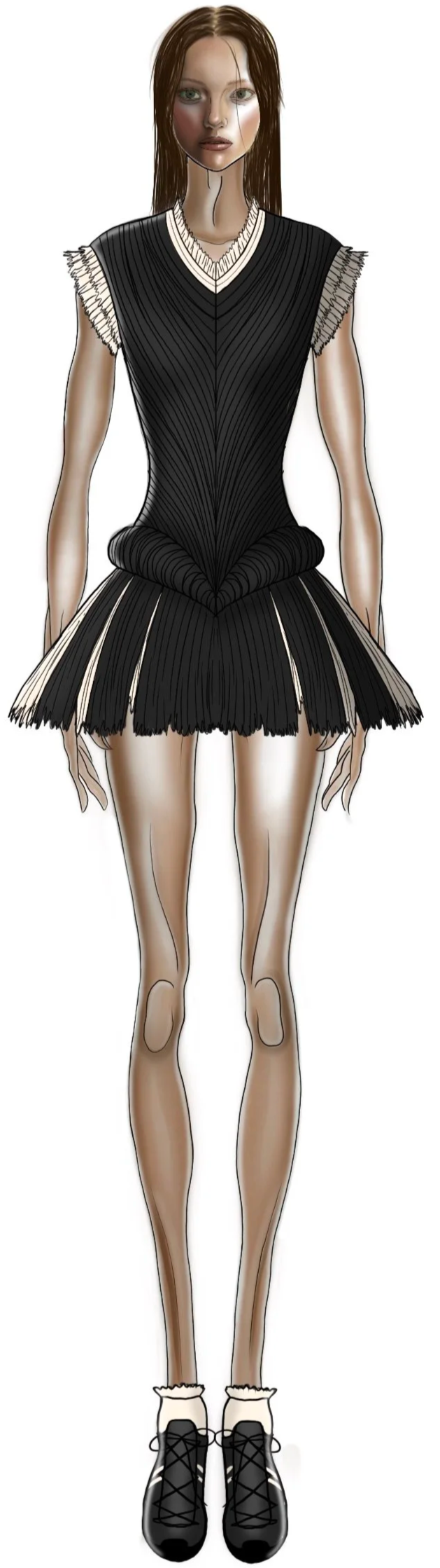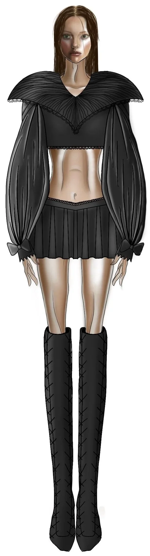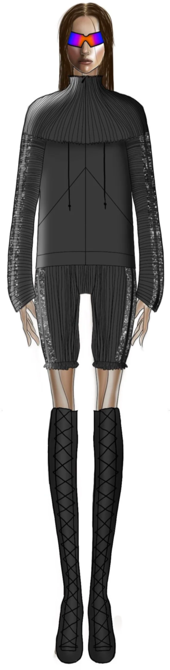 For my collection, I incorporated elements of body distortion to represent how humans mold themselves to move through society more successfully. Sports uniforms, workout gear, and athleisure helped flesh out silhouettes. I used pleating and volume to reference muscles and tendons. The name Push/Pull relates to the common name for workout split days as well as to describe the feeling of desire and obstacles. Beauty can come from a sad and dirty place, and I wanted this collection to reflect that. Born from my experience as a megalomaniac narcissistic crashout, this collection fused Victorian-era British fashion with modern athleticwear into an evening A/W collection.