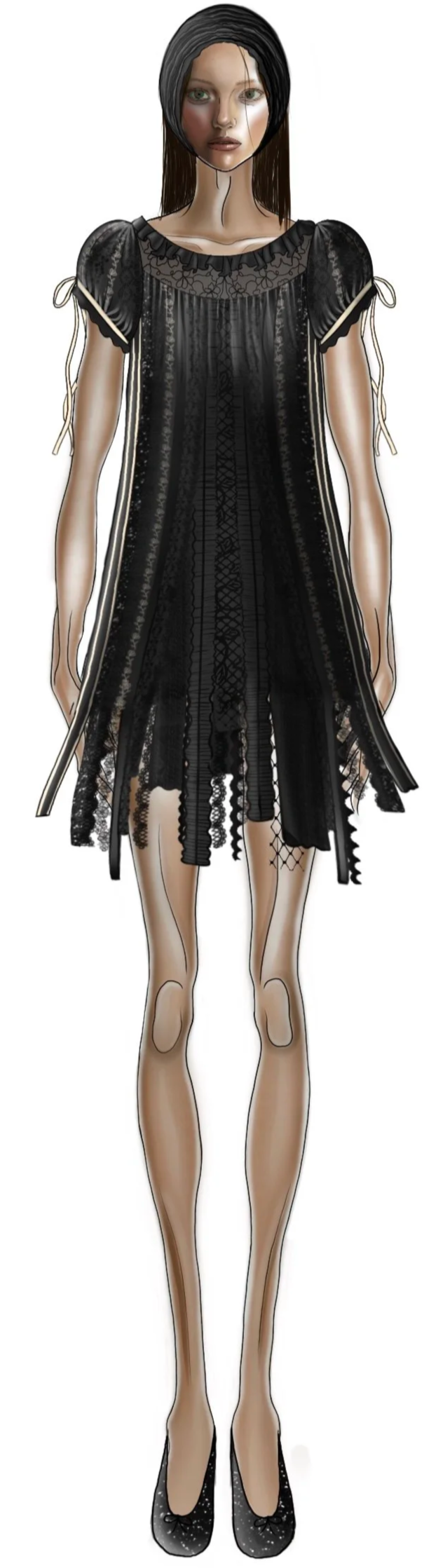 Growing Feeding Loving Waiting was inspired by wig making. Wig making involves weaving, sewing, and gluing. I explored patchwork, crochet, gluing, braiding, weaving, and sewing. My aesthetic for this project was slightly gothic, with formal and minimalist influences. I included only black and blonde colors as they are natural colors occuring in hair. I wanted to create a fall/winter collection that included mainly evening wear with some day looks. I enjoyed experimenting with braiding different materials into the hair. Along with my sketches, I am creating three coats; one with a glued hair cape with silver accessories, one patchwork coat, and one safety pin faux-weave coat. I also designed a safety-pin dress, multiple lace-and-chiffon patchwork dresses, and fully human-hair garments. I was interested in exploring the tension between emotional vulnerability and how we present ourselves to others. I felt that hair would be a good medium to explore that with due to how physically and emotionally close people tend to be with their hair. I enjoyed using thread as a mark-making device in the hair. I designed one dress utilizing this method. I wanted to incorporate some punk and goth influences into my designs. I did this by using safety pins, dark colors, patchwork, human hair, and stitches.